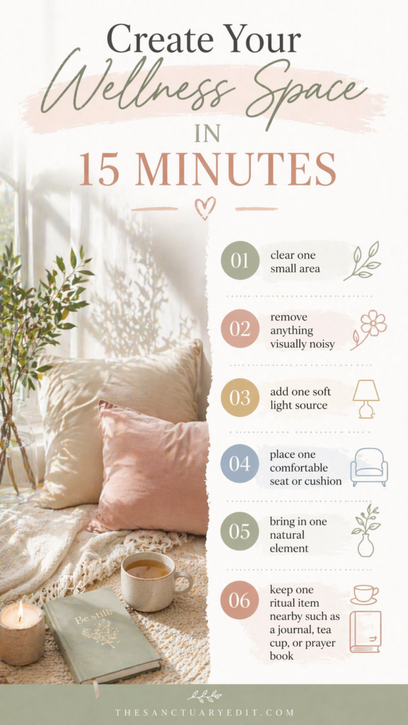If your wellness space will live in the bedroom, How To Create a Peaceful Small Bedroom Retreat With Natural Decor offers gentle ideas for making a small room feel restorative.